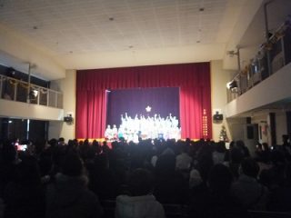 今日ホールにみんなで集まって、手遊びをしたりパネルシアターを楽しだり、先生の楽器の演奏に合わせて歌ったり、全園児で楽しみました。すると!どこからかサンタさんが来てくれて、子どもたちは喜んだり驚いたり、みんな大喜びでサンタさんを迎えました。