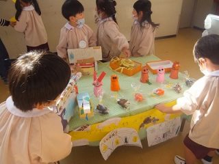 年中組の子どもたちは、どんなお店にするか?どんな商品を作るか?どんな材料で作るか?などなど、クラスのお友だちとたくさん話し合い、かたちにしてきました。