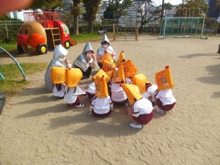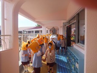 今回は満3歳児クラスの子どもたちも防災頭巾を被り園庭まで避難しました。ドキドキした経験だったと思いますが、頑張って先生と一緒に全員避難できました。