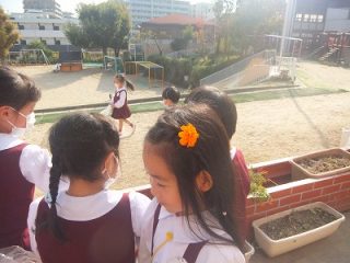 花壇の土入れ替えのため、1学期に入れ替えたお花を今日は特別に子どもたちに摘み取ってもらいました。