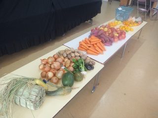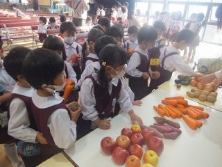 お家から持って来てくれた野菜や果物をホールに1人ずつ持って行き、机に並べました。色んな種類があるね!くんくんいい匂い!