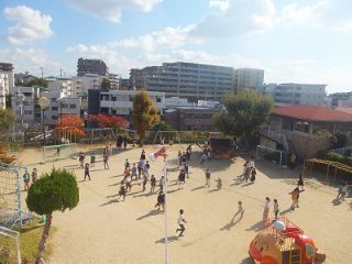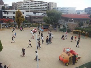 低学年はとにかく先生たちとオニごっこ。中学年はドッジボール。高学年は砂場や三輪車で遊んだり、友人と語り合ったり。