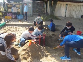 保育後にはお手伝いの保護者の方に来ていただき、古い土の中の根や草を取り除き、肥料等を混ぜて土入れ替えをしました。