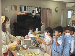 ナオミ幼稚園は、給食室から届いた給食を、担任の先生が1人ずつ食べれる量を考慮に入れて配膳しています。