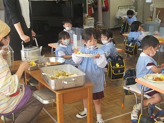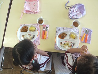 今日はにじ組さんが初めての給食日でした。食べる前にはお祈りをして、みんな美味しいねと全部食べることができました。