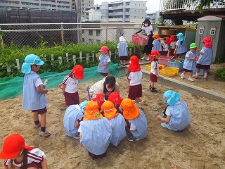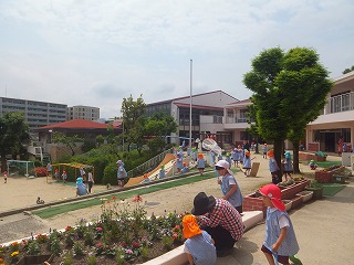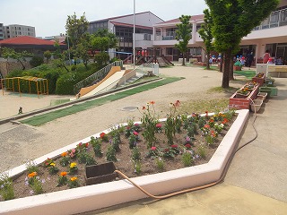 花壇の土を全部一度出して、その中に保水性や排水性がよくなる土壌改善材や腐葉土などの栄養等、いろんなものをブレンドして土を整え、新しい夏の花を植えました。子どもたちもお手伝い、小さな根っこを取り除いたり、お花を植えたり、お家の方と一緒に作業してくれました。