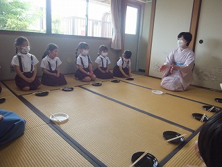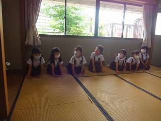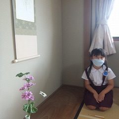 和室に入り、扇子を前に置いて挨拶をし、床の間の拝見をして、お作法の時間の流れを少しずつ経験している年長組さん。