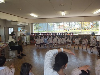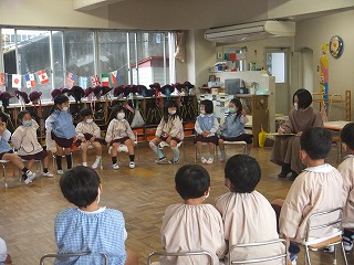 感謝って言葉は「ありがとう」だね。今日は誰にありがとうのお祈りをしよう?と尋ねると、子どもたちは「かみさま~」と答えてくれました。たくさんの神さまの豊かな恵みをいつもありがとう!たべものを食べて元気に遊べることができている喜び!いつも神さまありがとう!そんな気持ちで礼拝を守りました。