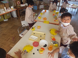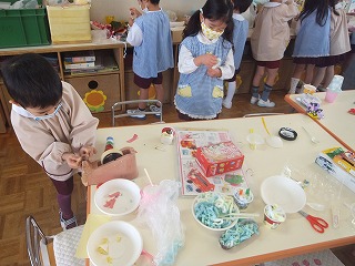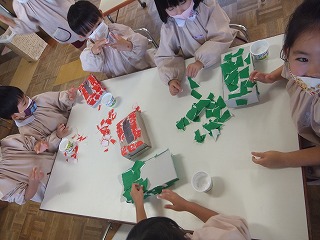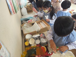 また今月末には年中組の「お店屋さんごっこ」があります。ご家庭からも廃材等を協力してもらい、少しずつ店舗の品物を作り始めています。先週からは、どんなお店にするかを話し合い、次にどんな材料で何を作るかを考え、クラスのみんなで話し合いの時間をたっぷり取り、意見を出し合ってます。自分のアイディアが一番の気持ちがいっぱいで、あれもこれもアイディアが浮かび収拾がつかなかったり、年中組ならではの意見交換の時間になりました。今後もお店を作り上げる過程で話し合いが続きます。色々な話し合いを通して、友だちの意見を聞いたり、みんなの前で意見を言えるようになったり、様々な成長を楽しみにしています。