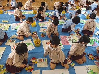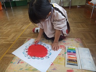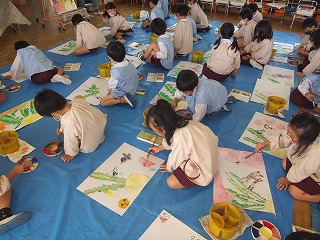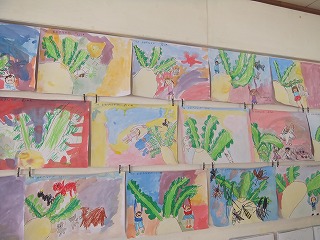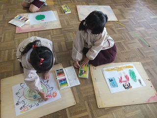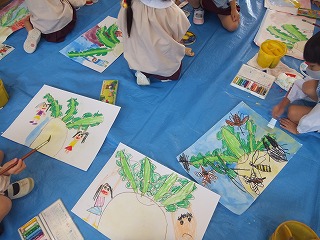 思い思いに大きなかぶを描き、想像を膨らまして好きな人物や動物、昆虫やキャラクターなどが引っ張っている様子を描きました。