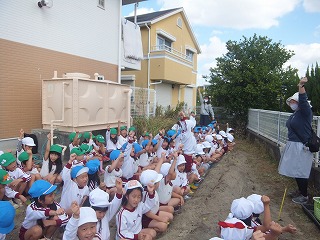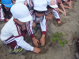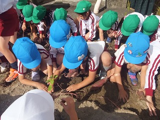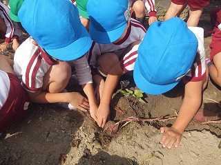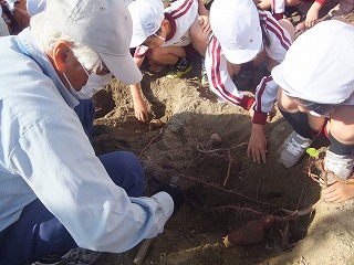 今年度から苗植えから日々のお世話を全て園務員さんにお願いしていたので、お芋畑に集まった年長さんは初めに「ありがとうございました」とお礼を伝え、掘り方の説明を受けてから堀り始めました。