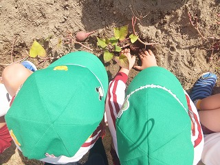 ちょっと土を掘ると、お芋が見えてみんな大興奮!