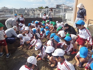 幼稚園中のプランターを集めて、根っこを取り除きたくさんの栄養を混ぜ込んで作業を進めました。係のお母さまと一緒に子どもたちもお手伝い!丁寧に苗や球根を植えてくれました。春になって、ちゅうりっぷがたくさん咲くのが楽しみですね!