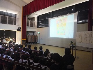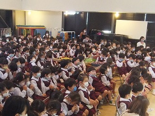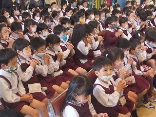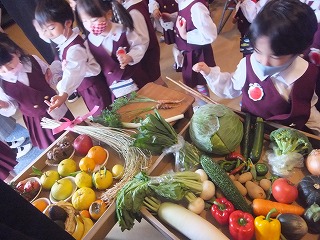 今日は収穫感謝礼拝をホールに集い、全園児で守りました。