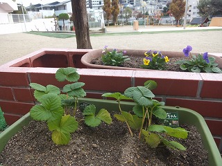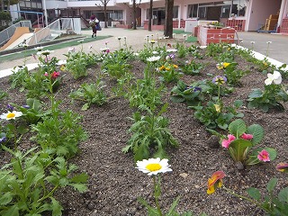 係のお母さま方に協力していただき、幼稚園の花壇に冬でも綺麗に咲いてくれるお花を植え替えました。