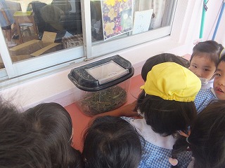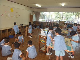 年中・年長組は、自由活動で遊んでいる間にアナウンスが聞こえ、急いで机の下に隠れたりだんご虫ポーズをして、「揺れが収まりました」のアナウンスまでじっとしていました。年少組は椅子に座り先生のお話を聞いている間にアナウンスがなりました。