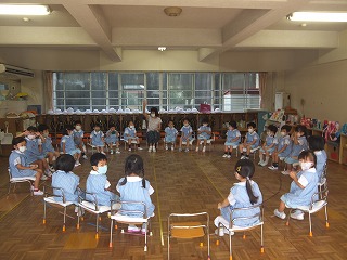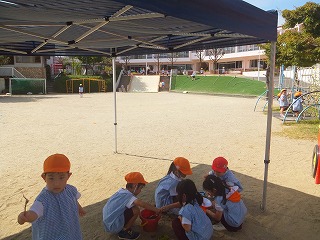 怪我無く前園児が園庭に避難できた後、先生から地震時の避難のお話を聞き、クラスに戻ってからも「この時ならどうしよう?」と話し合い、訓練を通して大切な命を守ることを考える1日になりました。