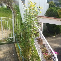 ひまわりみたいに背が高くて、葉っぱも大きい植物。菊の花にそっくりな黄色く可憐なお花が咲きます。