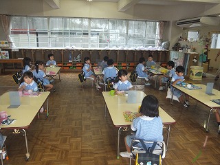 ちょっと声を発する場面があると、まるでゲームしているかのように「しー」とジェスチャーする姿もあり、子どもたち同士で意識する様子がありました。あまりにも静かな時間なので、各クラス音楽をかけて楽しい雰囲気を作っています。