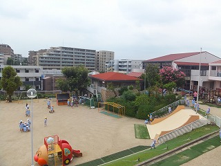 9/8現在、分散保育の様子を園舎2階より見渡しての見学となりますが、