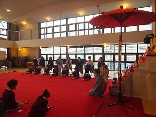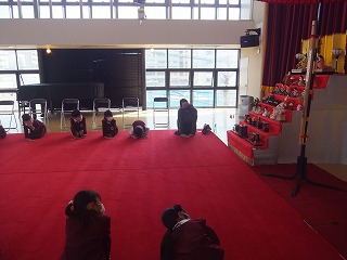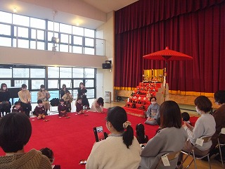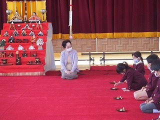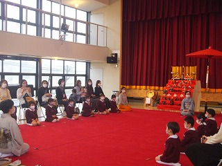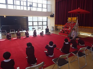 お雛様や野点傘が飾られ、子どもたちはいつもと違うホールに驚きと嬉しさの中、本番に向けて最後の確認をしました。