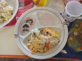 給食日の3月1日には、一足先にちらし寿司でお祝いしました。