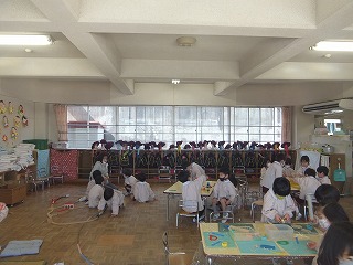 1クラスを3グループに分け、数人ずつが1クラスに集まって短時間合同遊びをしました。