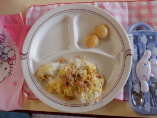 今日の献立は野菜いっぱいのそぼろご飯と野菜いっぱいのマロニースープでした。