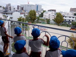 今日は運動会でも走る「リレー」をしました。男女別で走るため、応援の子どもたちは2階からコース全体を見て応援!!「がんばれ〜」「〇〇くみ〜」と大きな声で声援をおくっていました。