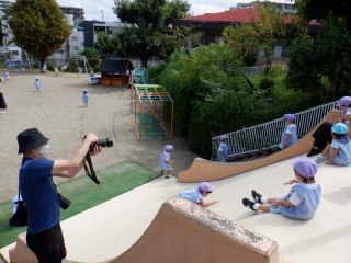 昨日と今日は年少組の1日写真撮影日でした。朝の自由活動の時間からお弁当を食べている時間まで、密着して撮影していただきました。写真は外遊びの時間を撮影しているところです!