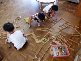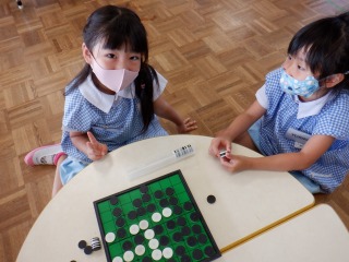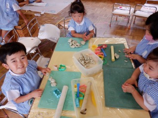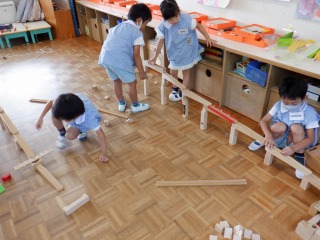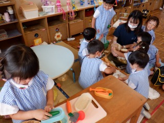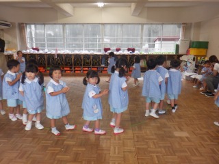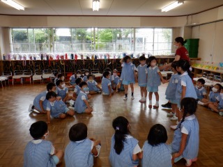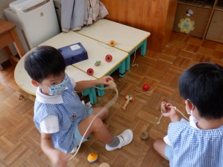 年長組はクラスの仲間意識も芽生え友だち同士で遊びを膨らませ楽しむ姿が多く見られます。運動会に向けて更に絆が深まる関係になれるよう、みんなで活動1つ1つを楽しんで、声をかけ合い、協力したり、話し合ったり、色々な関わりを大切にしていきたいと思います。