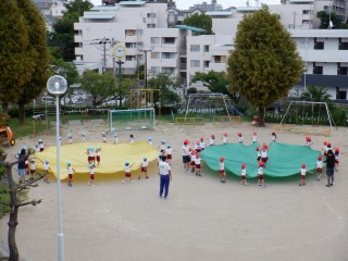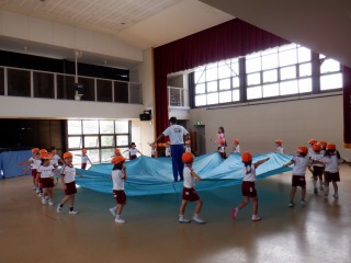 年中組さんが初めて園庭に出て、運動会の種目「パラバルーン」をしました。その姿を年少・中組の子どもたちが応援!!